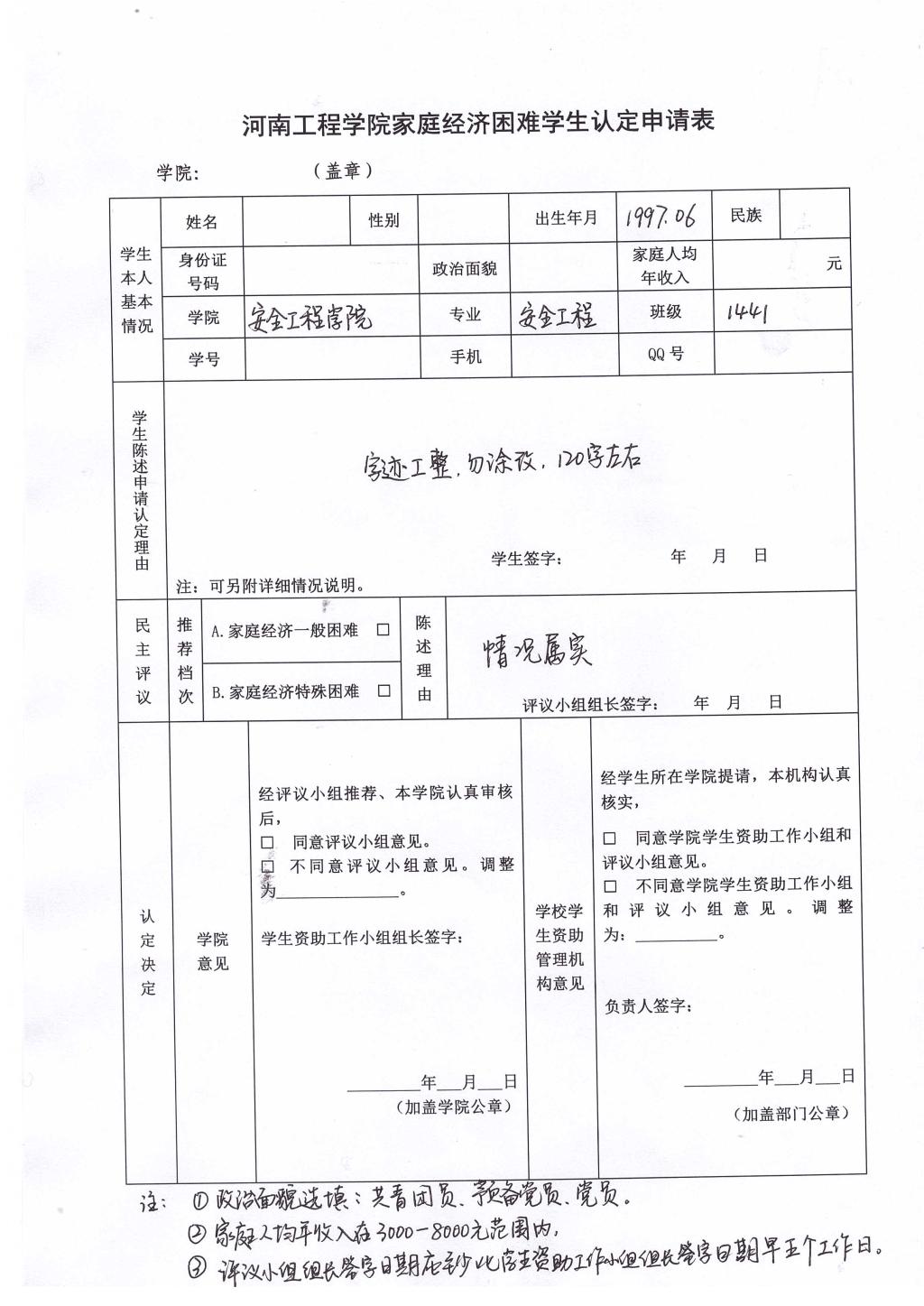 附件8:河南工程学院家庭经济困难学生认定申请表(填写模板)